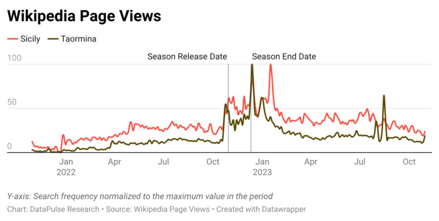 Similarly, the number of daily English-language Wikipedia page views for Sicily and Taormina saw a significant increase following the release of the second season.