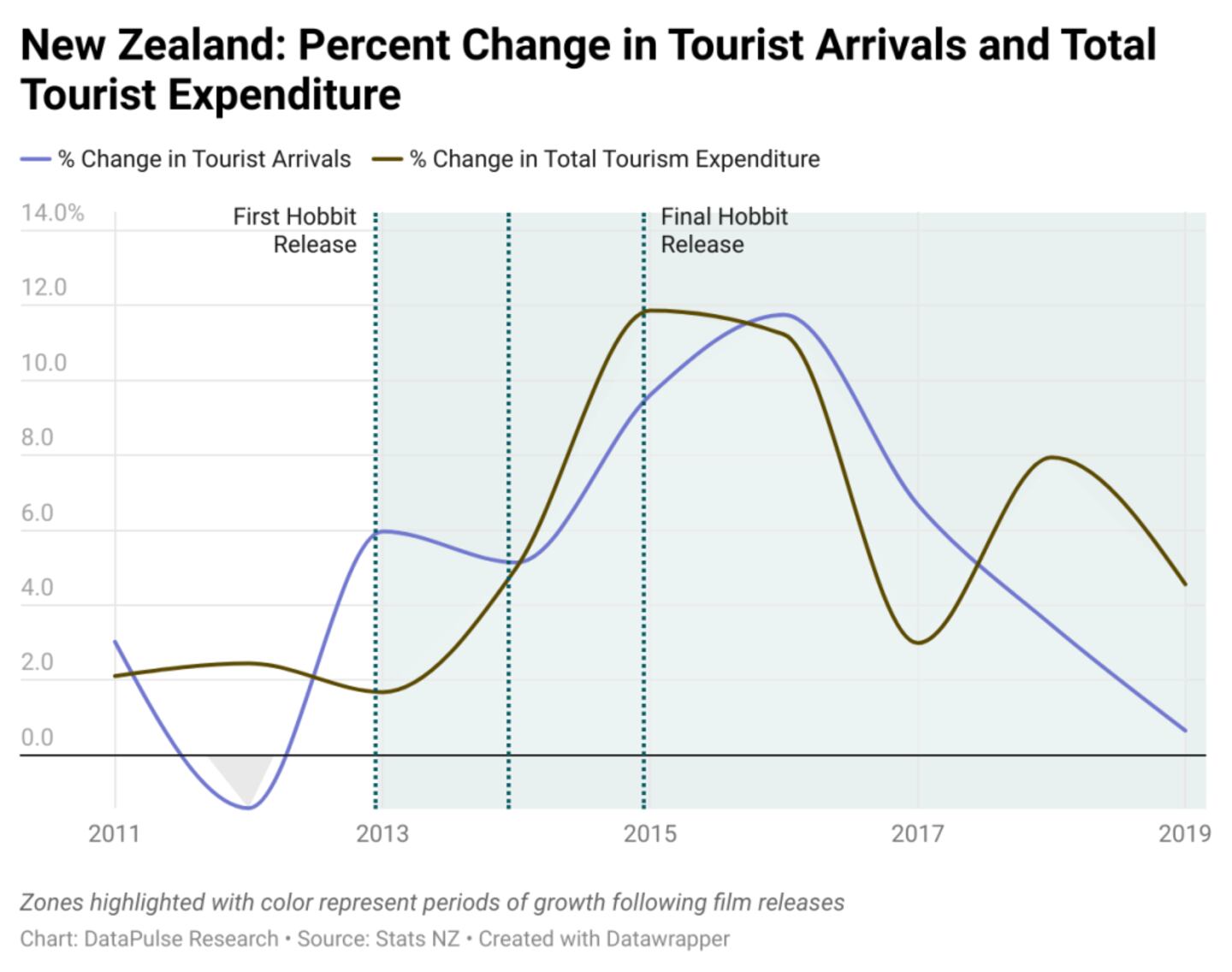 When “The Lord of the Rings” and “The Hobbit” trilogies launched in 2012, New Zealand was inundated with tourists keen to catch a glimpse of Middle Earth. As the chart below shows, the year-on-year growth rate in the number of tourists visiting New Zealand rose sharply from near zero in 2012 to more than 11% in 2016.