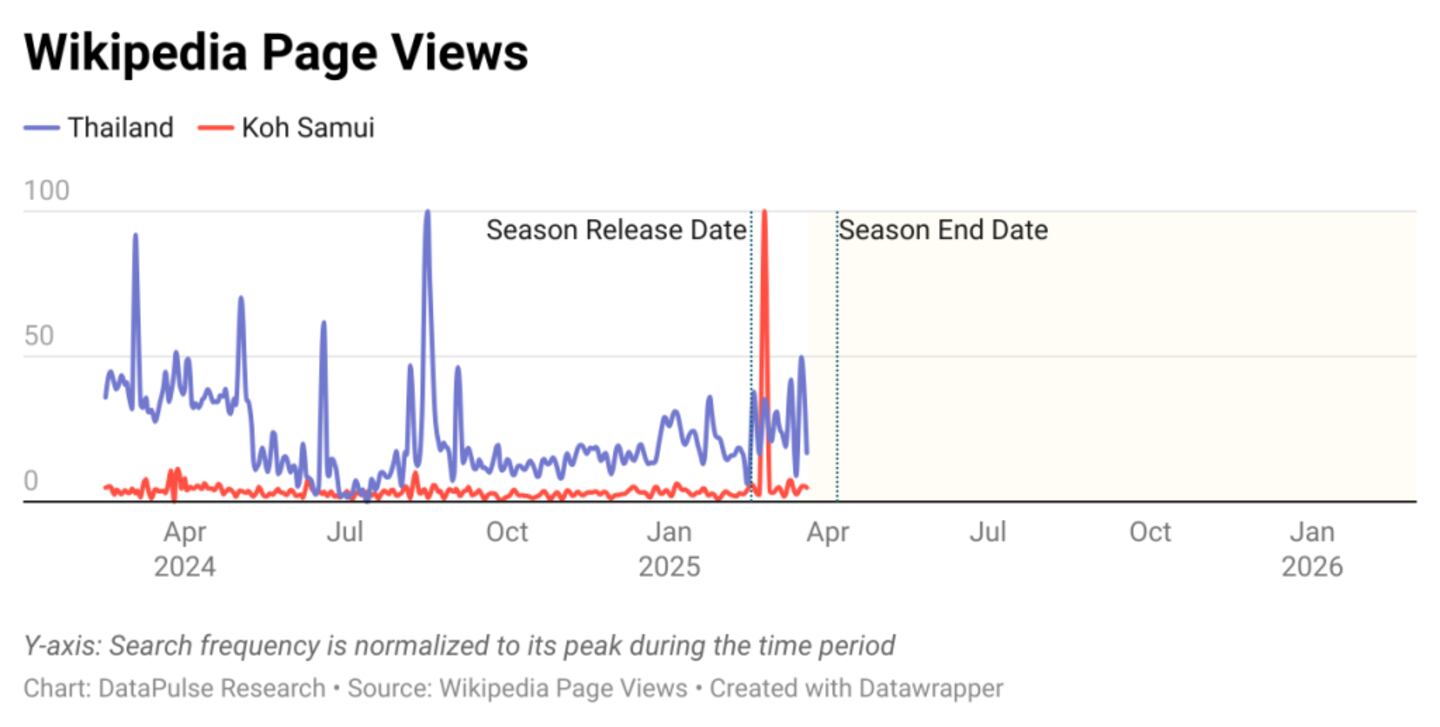 An analysis of Thailand’s Wiki page views does not reveal any obvious reaction to the season premiere, but daily page views for Koh Samui jumped 2,976% in the 24 hours after Episode 2 dropped.