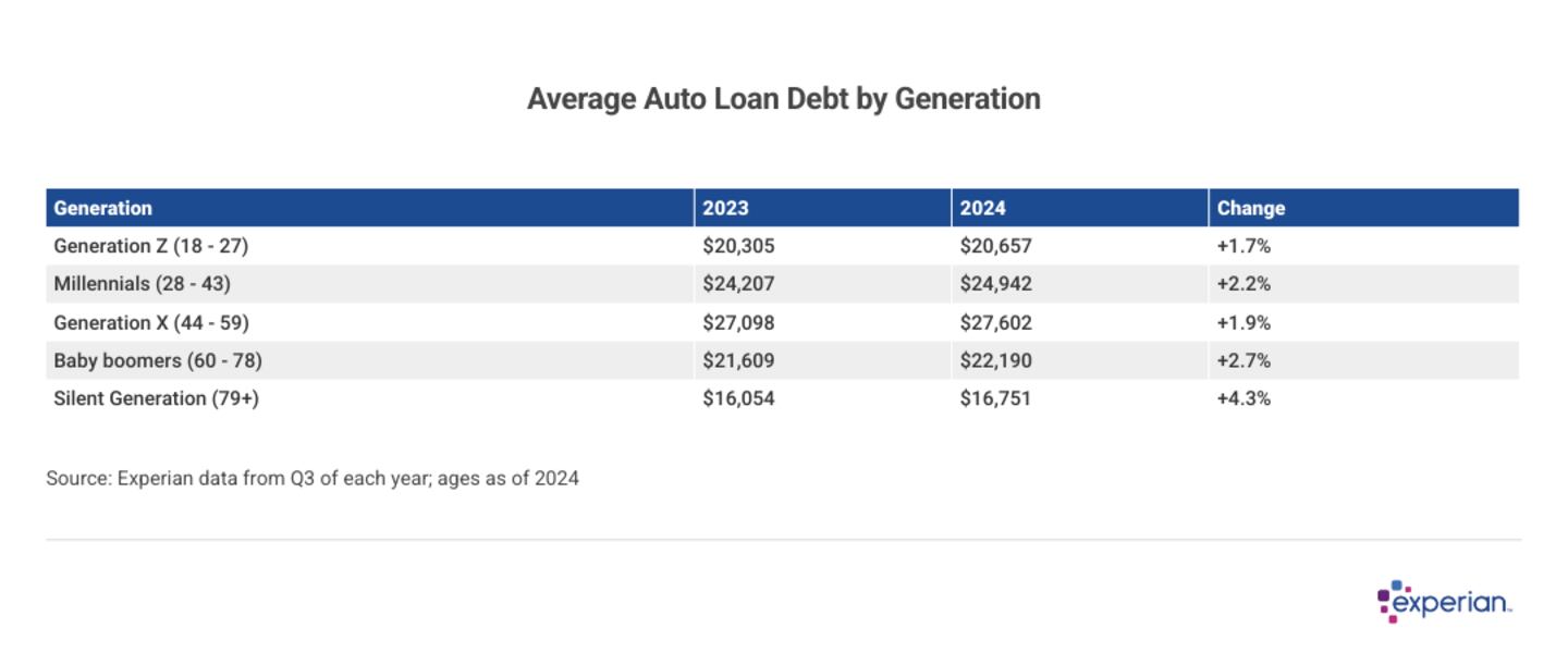 Gen X is still the generation carrying the largest auto debt on average, according to Experian data. However, its average balance increased by only 1.9%, slightly less than the national 2.1% increase.