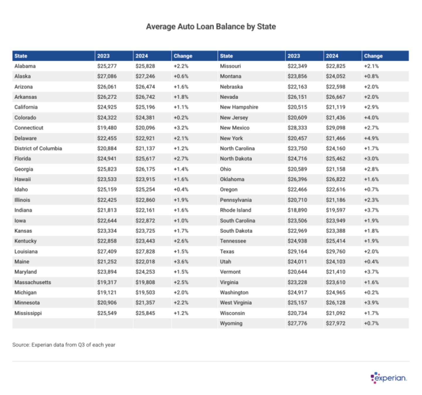 Auto balances still increased in every state and Washington, D.C., in 2024. Maine, New Jersey and New York state led the nation in average balance increases, each seeing a 3.5% or higher increase in 2024.