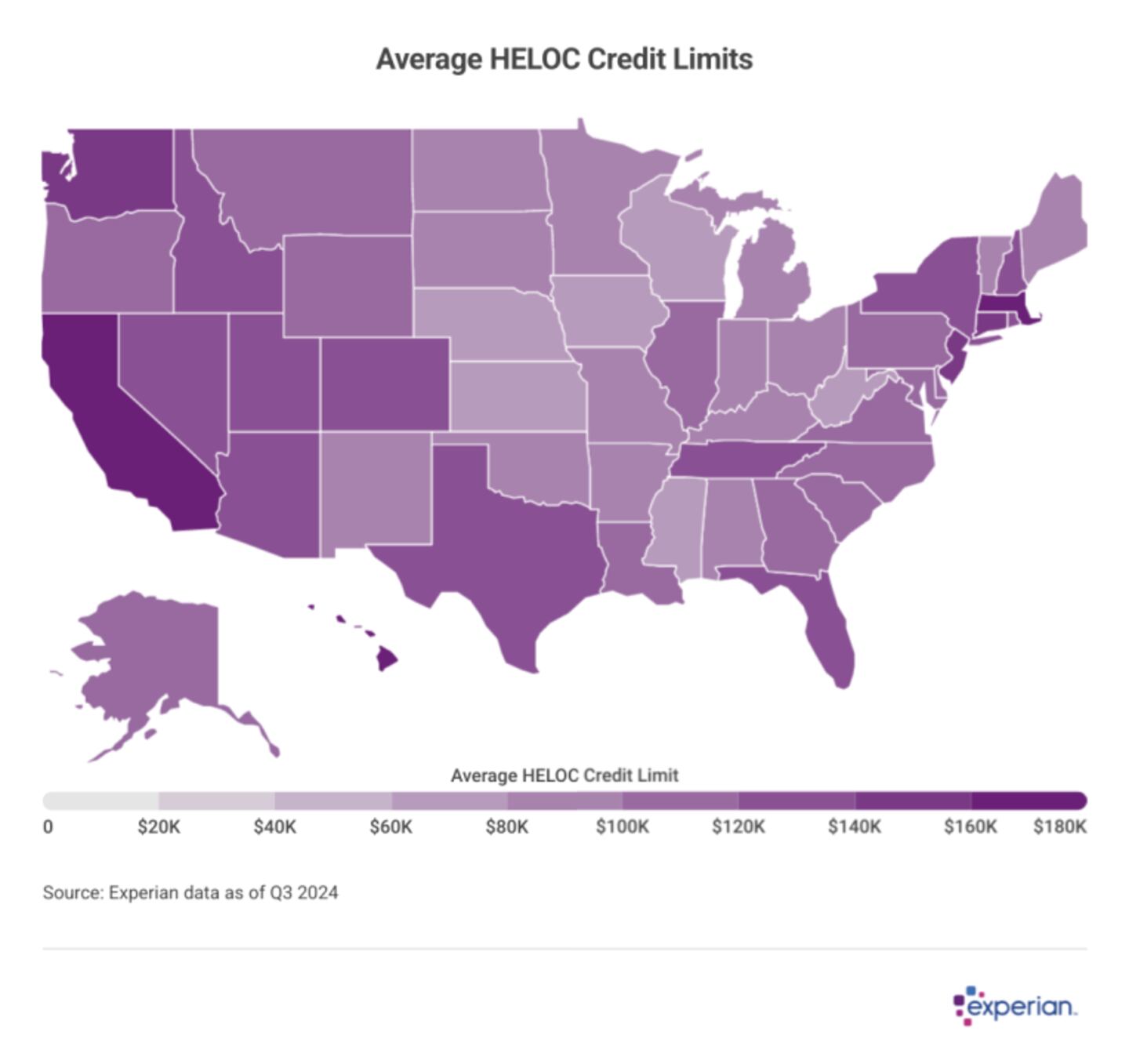 A combination of underlying equity and generally higher-than-average home prices explain the relatively larger HELOC credit limits in California and Massachusetts. Limits—as well as balances—are more modest in the Midwest. Only one state, Louisiana, saw the average fall slightly in 2024.