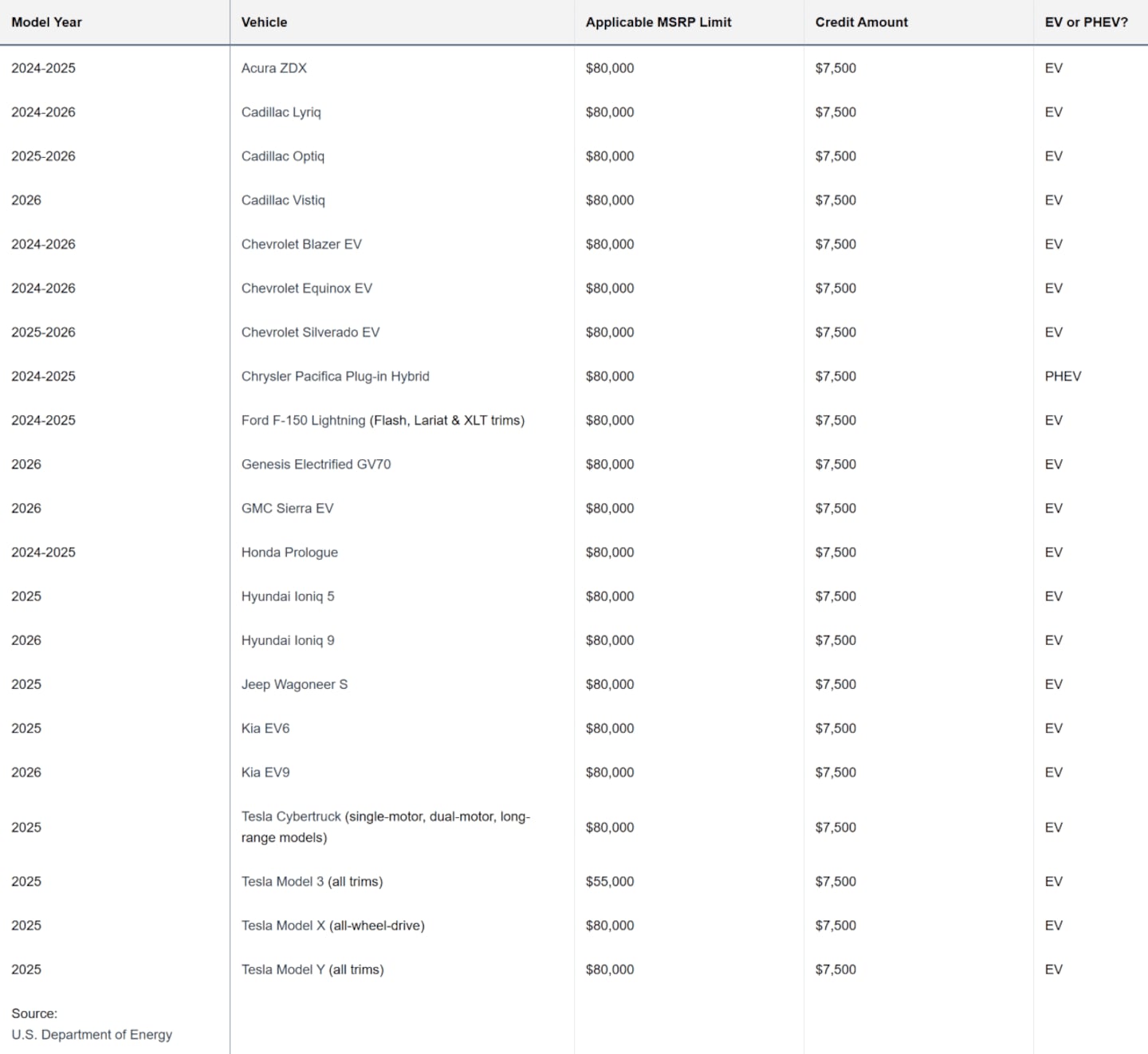 This list is based on data from the U.S. Department of Energy, last updated on May 19, 2025. It affects new cars placed in service from Jan. 1 through Sept. 30, 2025.