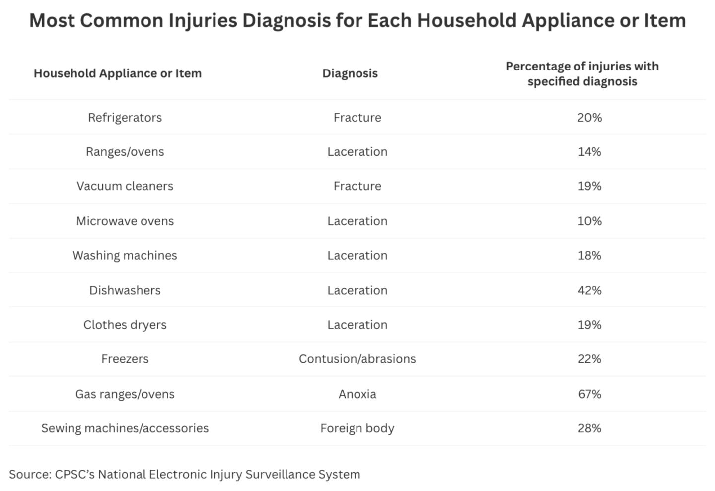 The CPSC also tracks the kinds of injuries most commonly caused by household appliances or items. The patterns are surprising.
