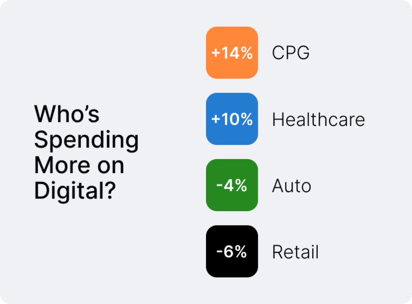 - Consumer packaged goods and healthcare have seen strong digital growth, with budgets rising 14% and 10%, respectively.