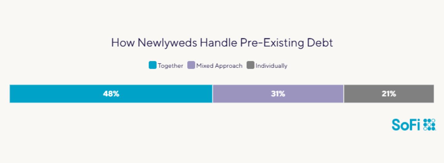When it comes to individual debts, SoFi’s Love and Money survey suggests that newlywed couples are generally upfront with each other about what they owe. Three-quarters of respondents said they told their partner about all their debt before they got married, and 19% partially disclosed their debt details. Only 6% kept mum about their outstanding balances.