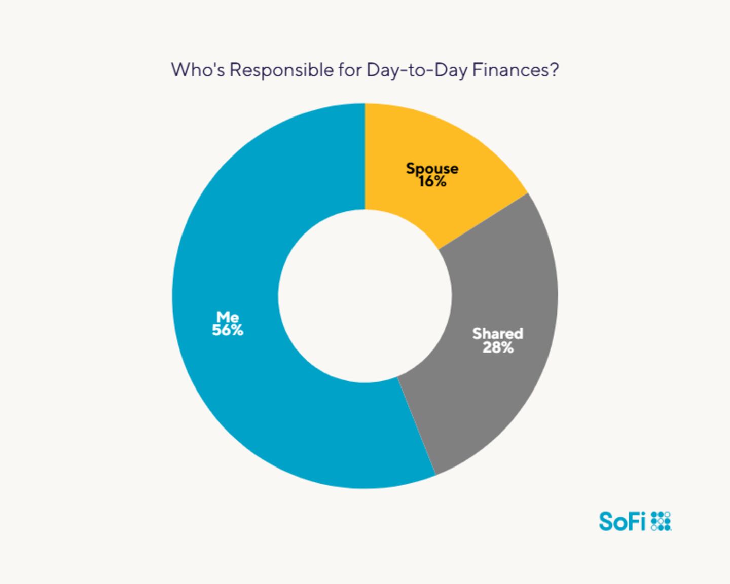 Most respondents to SoFi’s survey (72%) have one CFO (chief financial officer) in their marriage, while 28% share money management tasks. More specifically: