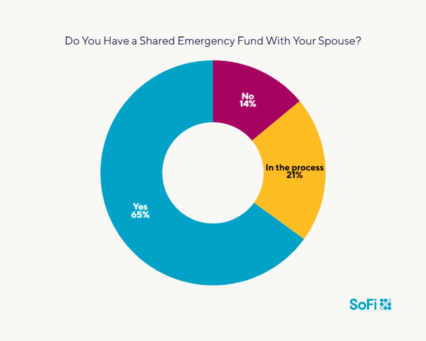 Newlyweds have largely gotten the message: Over half (65%) have already set up a shared emergency savings fund, while 21% are in the process of creating one. Only 14% of the couples in SoFi’s survey haven’t yet established an emergency fund.