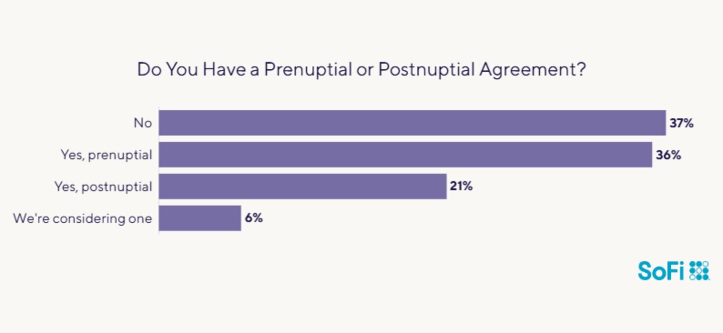 A growing number of couples are signing legal contracts that spell out how financial assets will be handled in the event of a divorce: Prenups that are signed before marriage, and postnups that are signed after a couple walks down the aisle. SoFi’s recent survey of soon-to-be-married couples found that 14% were considering a prenup. In this survey, a full 36% of respondents said they have a prenuptial agreement, while 21% have a postnuptial contract. Another 6% are considering one of these contracts.