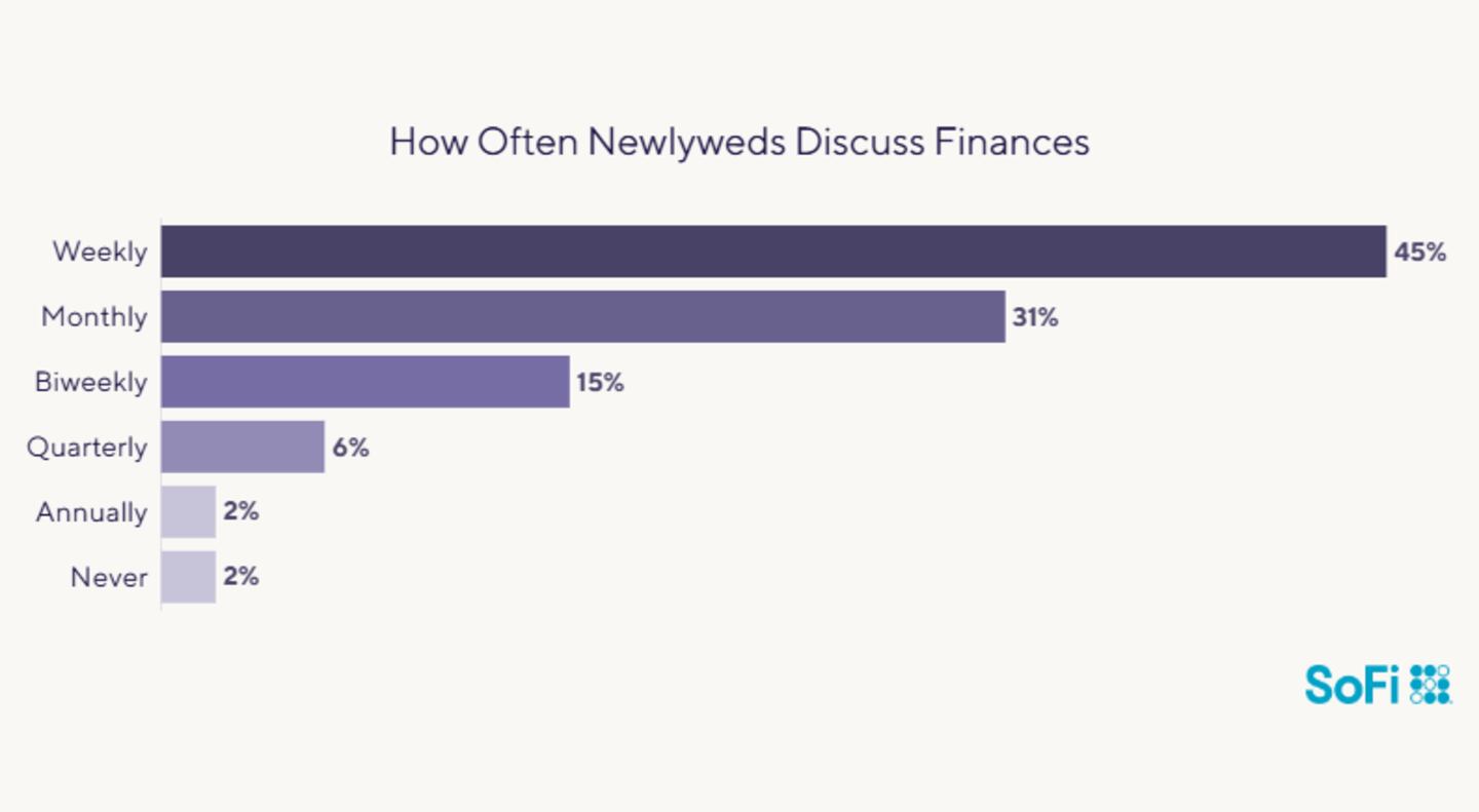 In general, communicating about finances is a priority for couples in SoFi's survey. About a third of couples in our poll talk to their partners about money monthly, while 45% discuss money weekly, and 15% converse about financial topics biweekly.