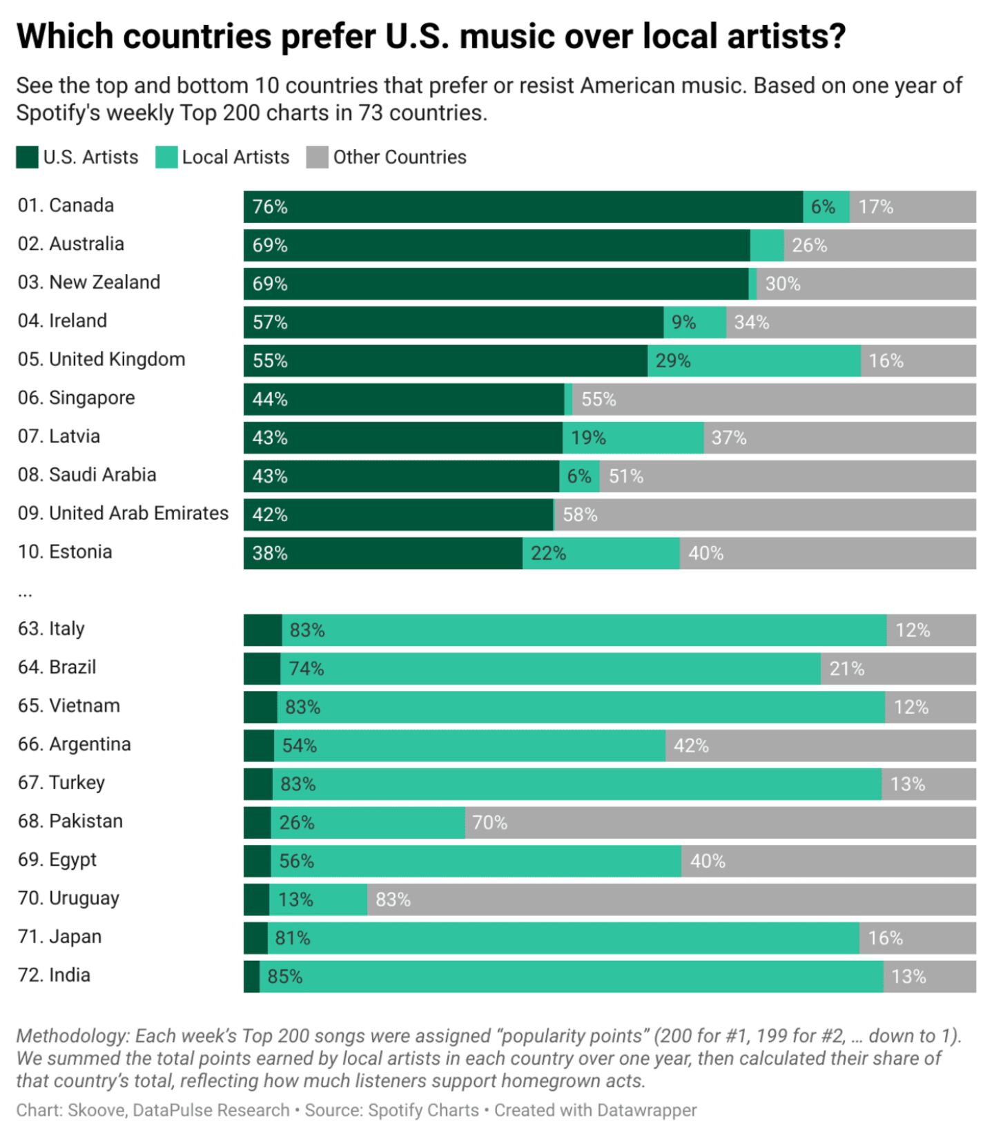 - American music conquers the Anglosphere: Canada allocates 76% of chart positions to U.S. music, while India resists at just 2%.