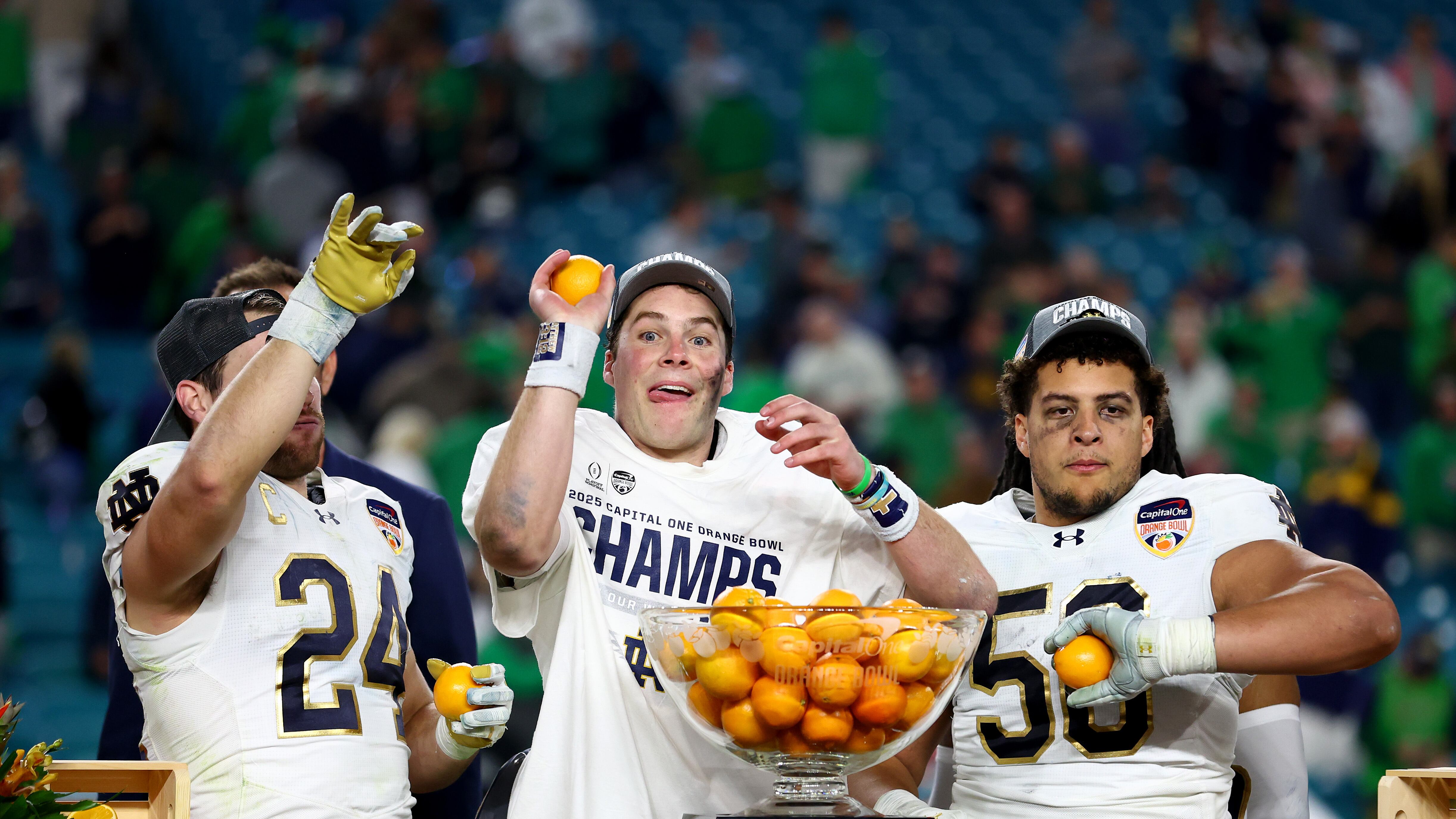 Notre Dame awaits the winner of the Cotton Bowl in the College Football Playoff national championship game after the Irish beat Penn State 27-24 in the Orange Bowl on Thursday night.