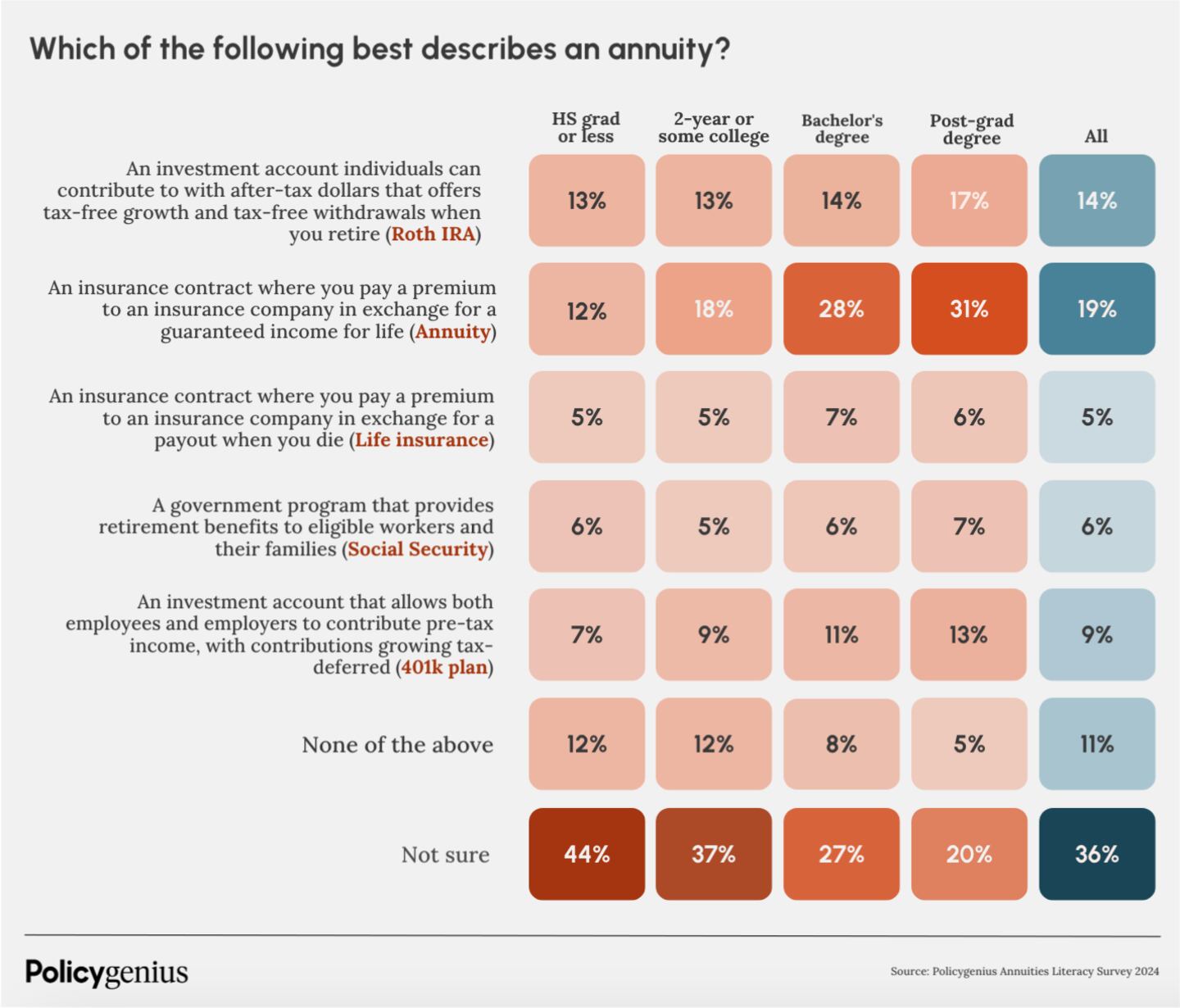 In fact, 14% of all respondents matched an annuity to the definition of a Roth IRA. Further, 9% of all respondents matched an annuity to the definition of a 401(k) plan. And 17% and 13% of adults with a postgraduate degree matched the definition of an annuity to a Roth IRA or 401(k), respectively.