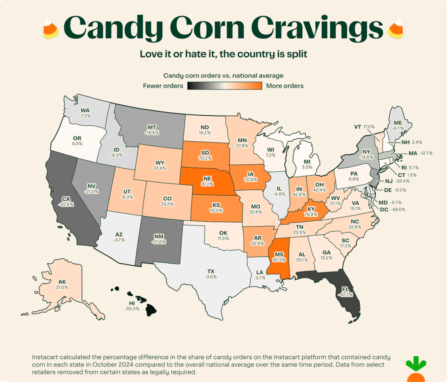 Few Halloween candies spark as much debate as candy corn, and Instacart data shows just how differently states feel about it. During October, candy corn consistently makes up 2–3% of all candy orders on Instacart, proving that despite its polarizing reputation, this festive classic remains a steady staple. While some states can't get enough, others want nothing to do with it: