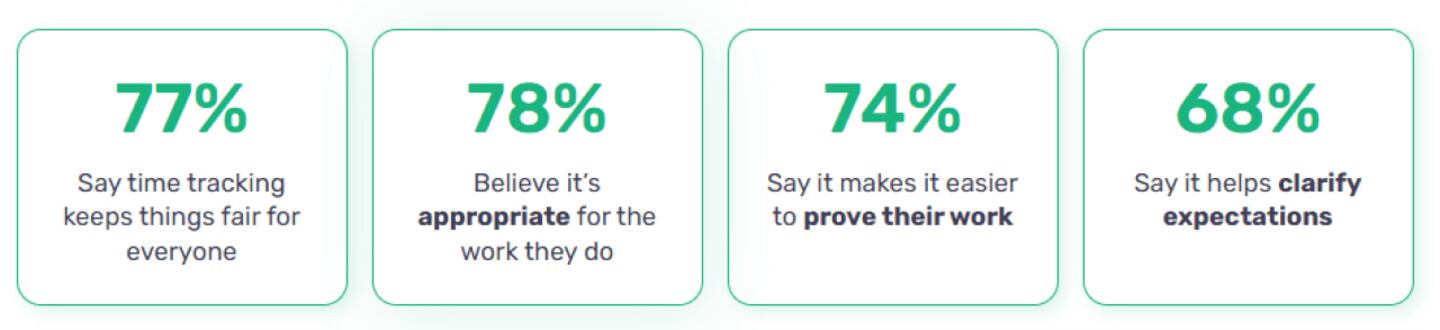 Beyond voice, fairness and clarity also matter. Time management should be treated as an organizational priority, not an individual burden, and companies that invest in clearer roles, better systems, and consistent communication reduce micromanagement risk and build trust. This survey shows that when companies get time tracking right in these ways, employees recognize it. More than three-quarters (77%) say that time tracking keeps things fair for everyone, and a similar number (78%) believe that it's appropriate for the work they do. Another 74% say it makes it easier to prove their work, and 68% report that it helps clarify expectations.