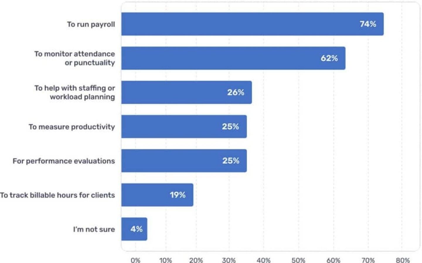 For most organizations, payroll is the main driver behind time tracking. Nearly three-quarters of the survey's respondents say their employer uses tracking systems to run payroll, with just over six in ten citing attendance or punctuality. This shows that time tracking is fundamentally about ensuring accurate pay, but also about maintaining accountability for when and how work gets done.