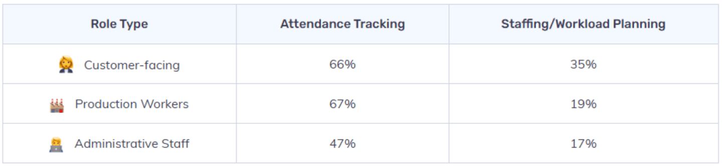 But the purpose of tracking doesn’t look the same for everyone. Customer-facing employees (like cashiers, sales associates, and support reps) and production workers are much more likely to see attendance as the main reason for tracking (66% and 67%), compared to just 47% of administrative staff. On the other hand, customer-facing workers cite staffing and workload planning at 35%, compared to 19% by those in production and 17% in administrative roles. These findings suggest that for customer-facing roles, tracking isn’t just about clocking in — it’s a tool for managing unpredictable demand and scheduling needs.