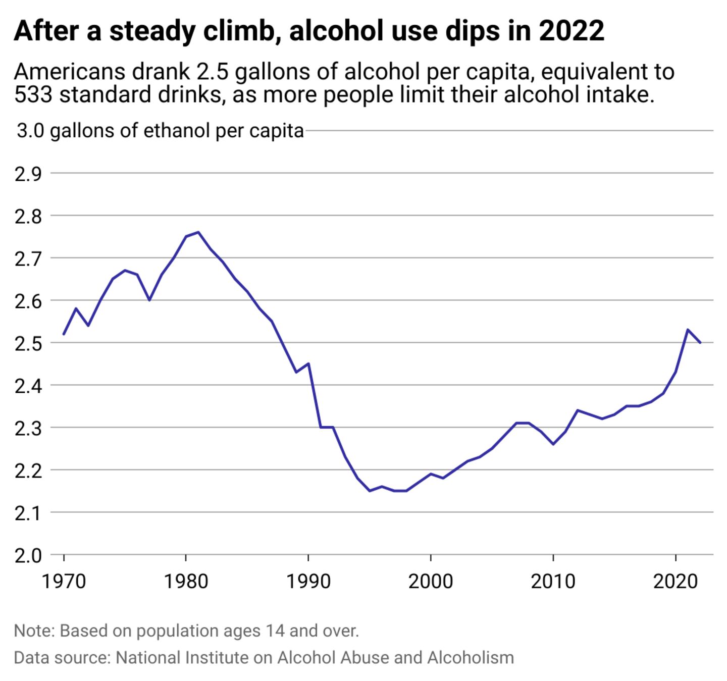 In 2022, Americans drank about 2.5 gallons of alcohol, or 533 standard drinks, in a year, according to a National Institute on Alcohol Abuse and Alcoholism report released in 2024. It represents a 1.2% decrease from the year before and comes as more Americans consider drinking alcohol bad for health.