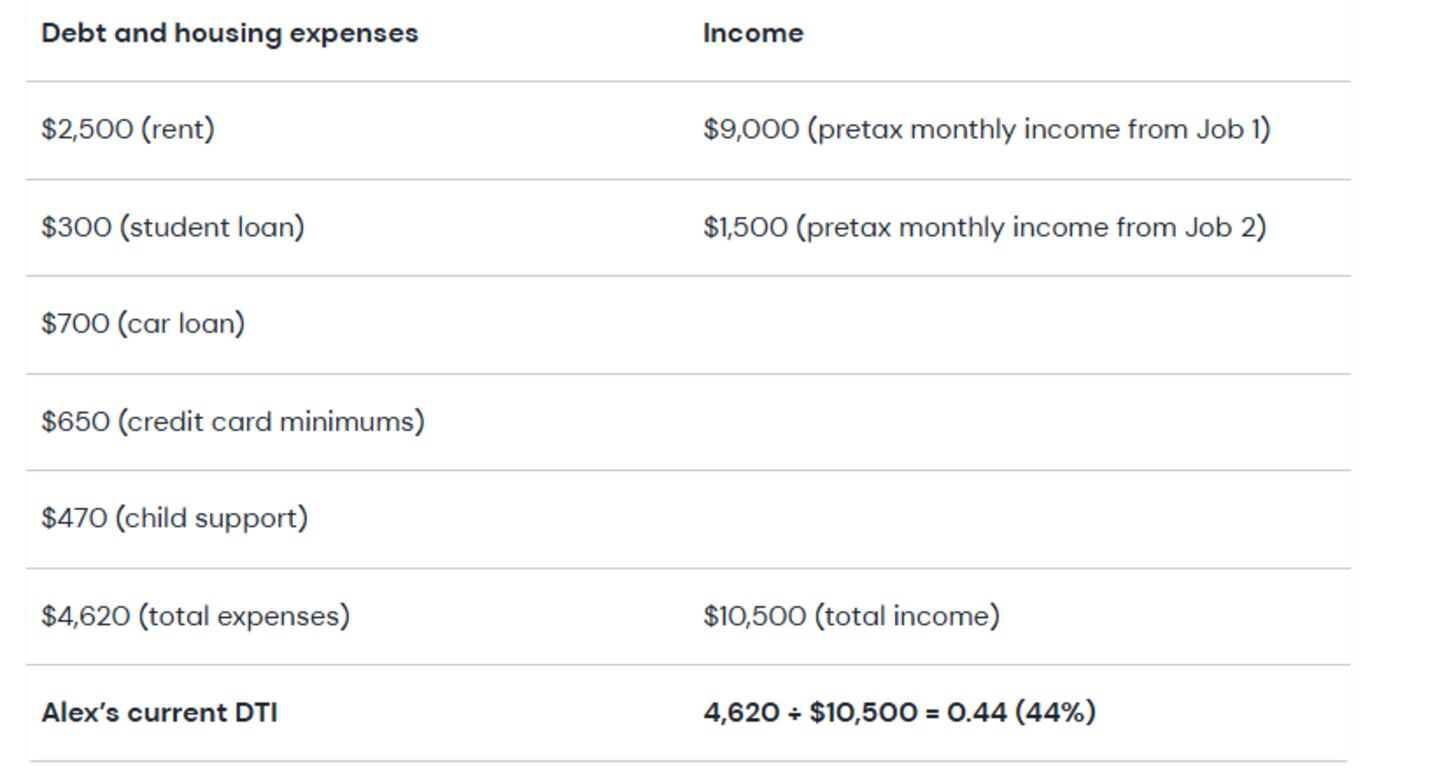 A personal loan lender might decline to offer Alex a loan, because any new payment looks unaffordable. If Alex can afford it, a great way to lower DTI would be to pay down (or pay off) the credit card debt and eliminate that expense.