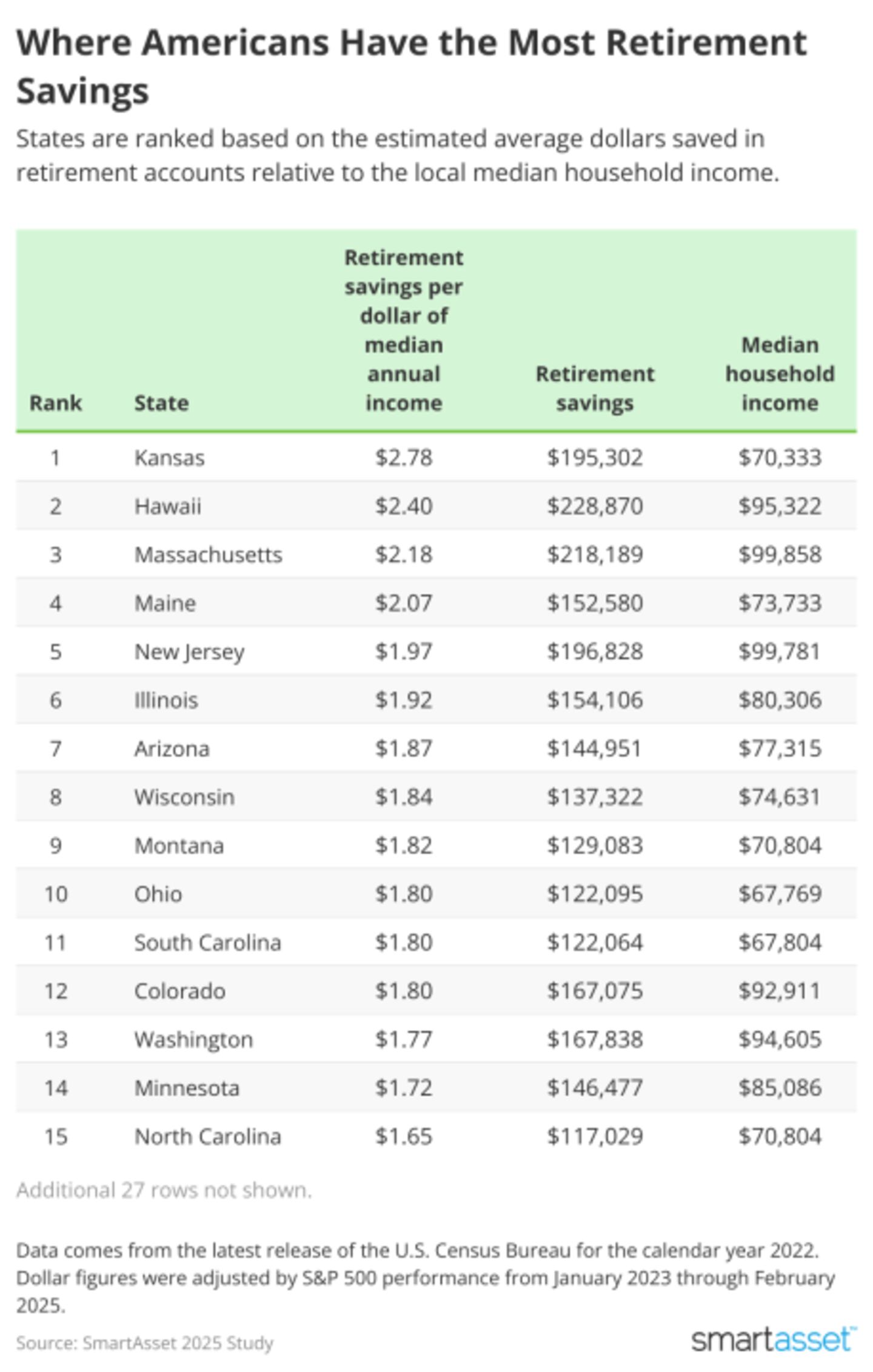 With this in mind, SmartAsset ranked U.S. states based on the latest retirement savings data from the Census Bureau, adjusted to 2025 dollars based on S&P 500 growth. Median household income is also compared to retirement savings, providing a clearer picture of retirement preparedness across the country.