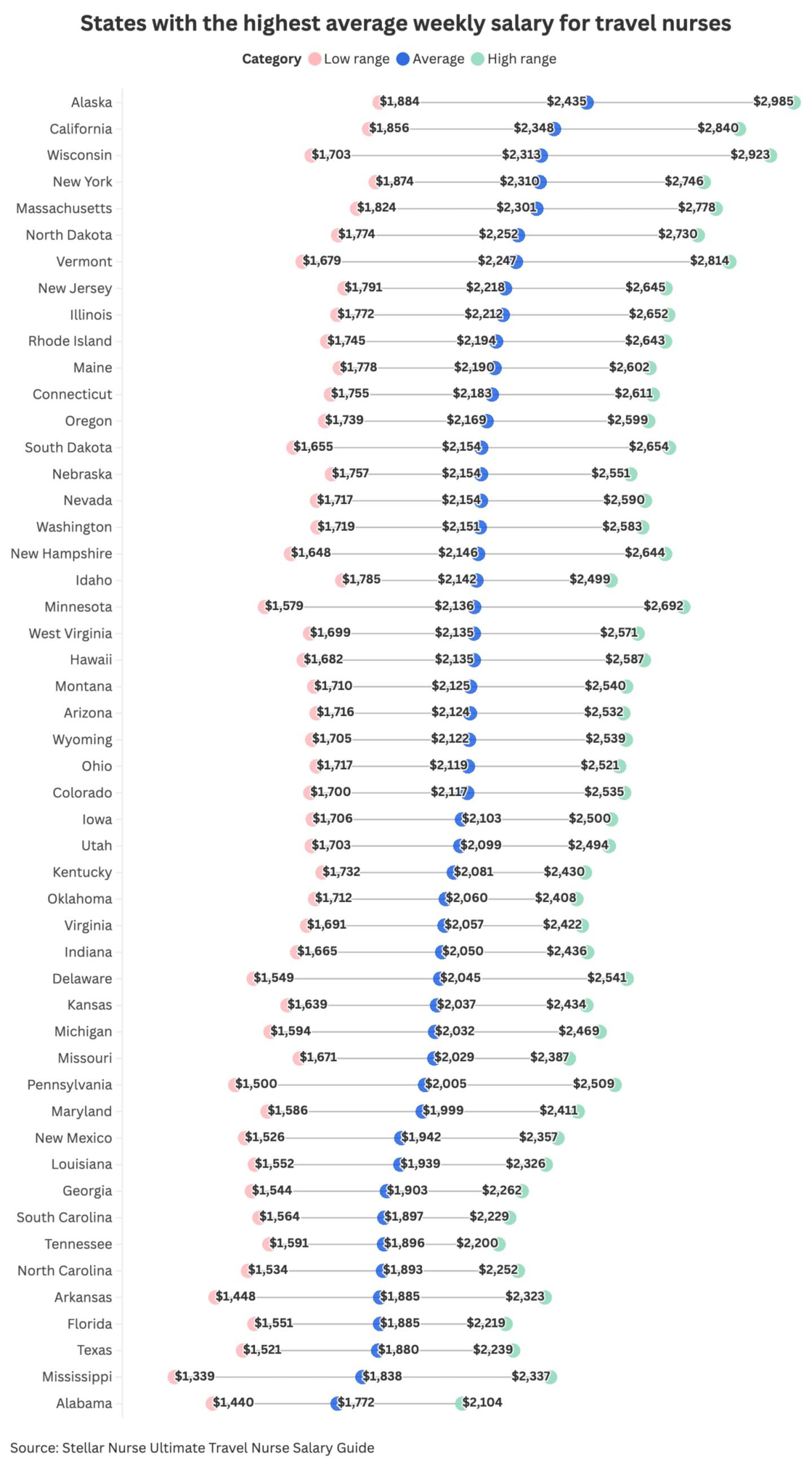 Travel nurse pay swings hard depending on where you go. According to the Stellar Nurse Ultimate Travel Nurse Salary Guide, Alaska leads the pack with an average weekly wage of $2,435. California isn’t far behind at $2,348, followed by Wisconsin ($2,313), New York ($2,310), and Massachusetts ($2,301). These high-paying states usually come with higher living costs, strong union presence, and big-city hospital demand.