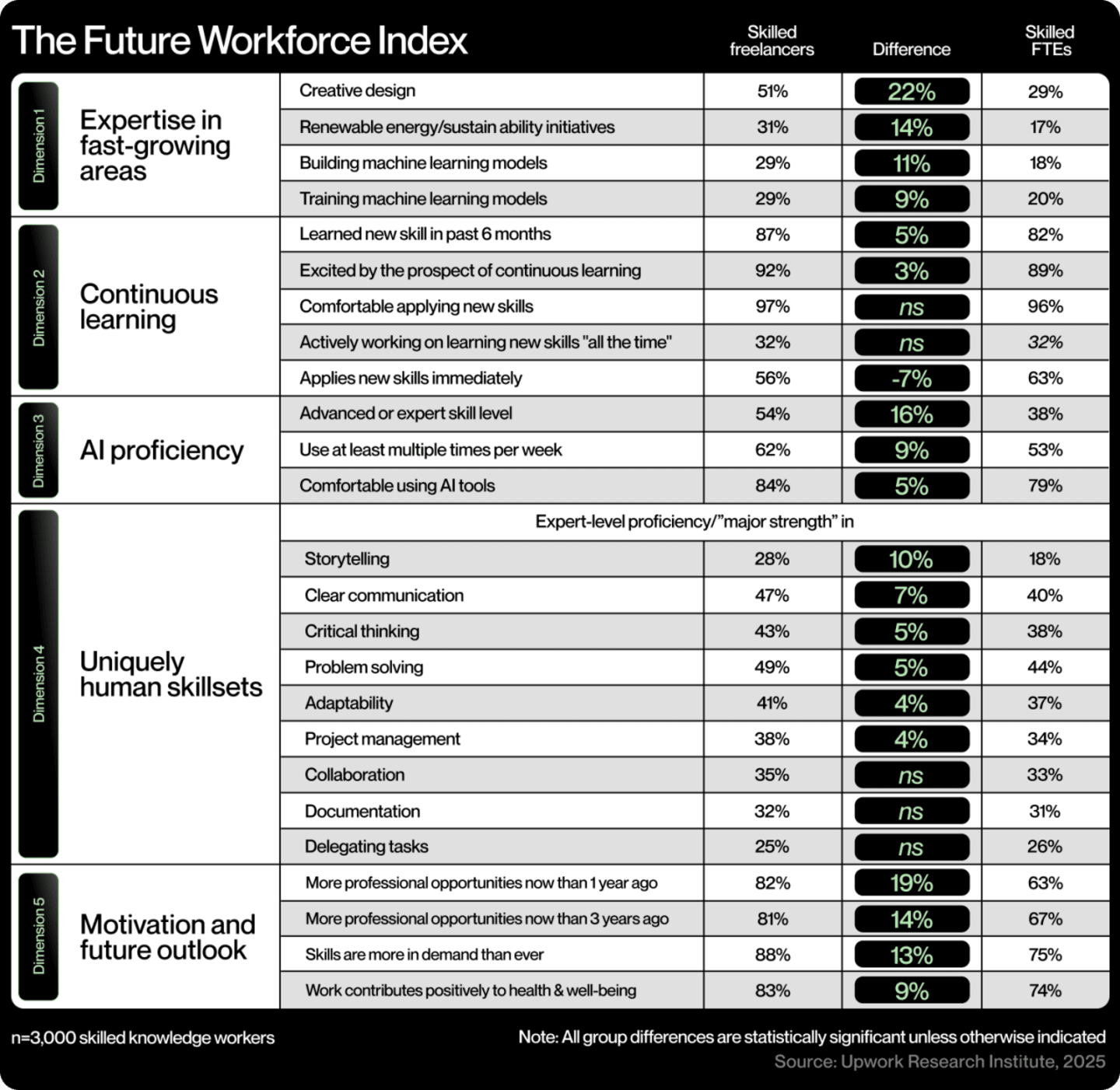 Among 3,000 skilled knowledge workers surveyed, freelancers consistently reported stronger capabilities in effective communication, critical thinking, adaptability, and problem-solving.